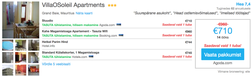Kui otsid soodsa hinnaga öömaja Mauritiusel, siis soovitame parima ülevaate ja hinna saamiseks kasutada hotellihindade võrdlusportaali Hotelscombined.ee Järgnevalt mõned näited soodsatest saadaolevatest pakkumistest vahemikus 14.12-28.12 (vastavad lennupiletid SIIN).