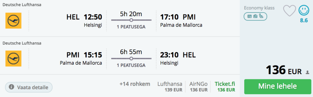 Lufthansa pakub hetkel väga hea hinnaga lennupileteid aprilliks ning maiks Helsingist Mallorca saarele. Edasi-tagasi lennupiletite hinnad algavad 136€. Lennud toimuvad üle Müncheni või Frankfurdi.