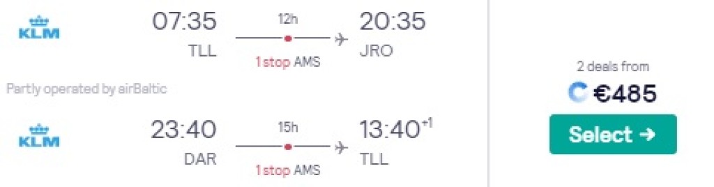 Hetkel leiad väga hea hinnaga lennupileteid Tallinnast Tansaaniasse. Edasi-tagasi lennupiletid Kilimanjarosse saab kätte alates 411€ eest. Soodsa hinnaga lennupileteid pakub KLM. Hea hinnaga lennupileteid leiab jaanuarist kuni maini. Piletiteni jõudmiseks kasuta allpool olevaid otselinke või otsi endale huvipakkuvad lennupiletid üles läbi Skyscanneri.