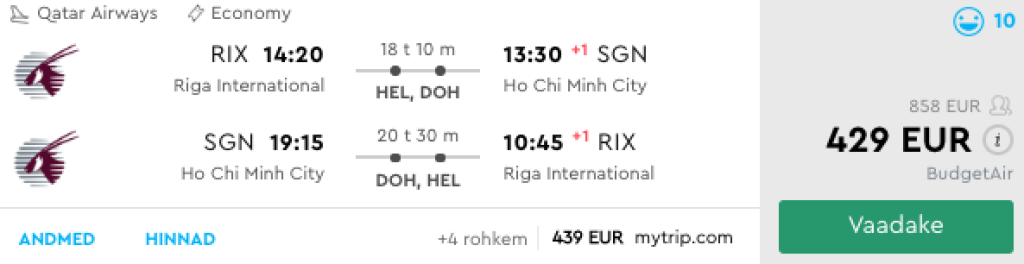 Qatar Airways koostöös Finnairiga pakub hetkel suurepärase hinnaga lennupileteid sügiseks ja talveks Riiast Vietnami. Soodsaimad edasi-tagasi lennupiletid Riiast Ho Chi Minh Citysse leiab üles vaid 429€ eest. Lendudel on kaks ümberistumist, Helsingis ning Dohas. Lennupiletite hinna sees sisaldub ka äraantav pagas ning toitlustamine Qatar Airwaysi pardal. Toome allpool välja ka soodsa _open-jaw _ variandi võimalusega teha tagasilend hoopis kõrvalriigist, Kambodžast. Parima hinnaga lennupiletid leiad üles läbi Momondo.ee