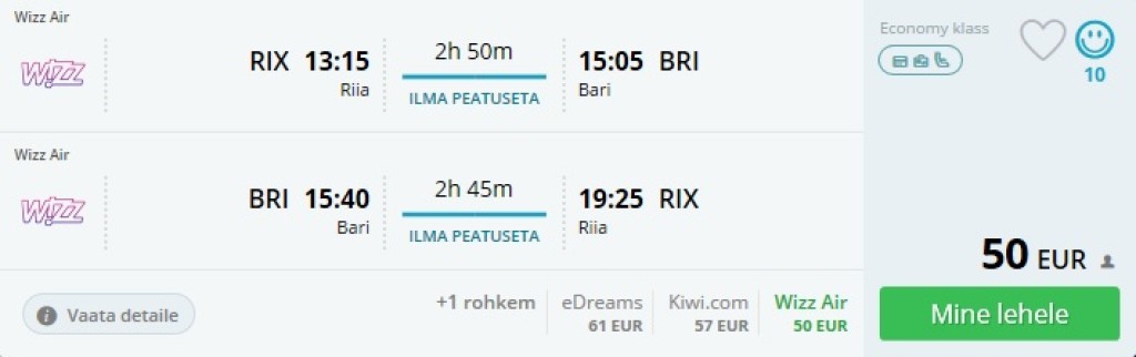 Tegemist on otselendudega Riia ning Bari vahel ning Wizzair lendab Riiast Barisse 2x nädalas, kolmapäeviti ja pühapäeviti. Wizzair on odavlennufirma, seega piletihinna sees on käsipagas (kuni 10kg).