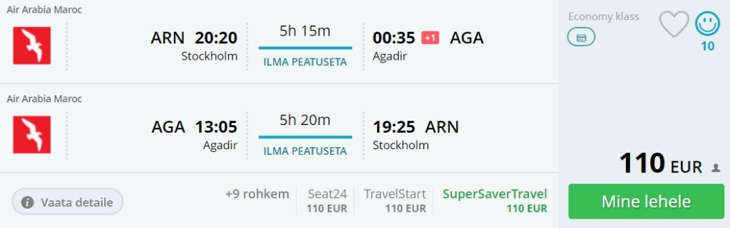 Odavlennufirma Air Arabia pakub talvel lennupileteid Stockholmist Marokosse Agadiri hinnaga alates 110€. Sellise hinnaga pileteid on saada detsembris (v.a. jõulud ja aastavahetus) ning jaanuarist märtsi alguseni. Lennud toimuvad 2x nädalas teisipäeviti ja reedeti ning hinda 110€ leiab märgitud ajavahemikus enamikel lennupäevadel.