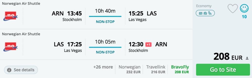 Norra odavlennufirma Norwegian pakub hetkel vägagi hea hinnaga lennupileteid Stockholmist Las Vegasesse. Edasi-tagasi lennupiletite hinnad on saadaval hinnaga al. 208€. Tallinnast Stockholmi leiab hetkel kõige soodsamad lennupiletid airBalticuga läbi Riia. Soodsaid lennupileteid Stockholmist Las Vegasesse leiab novembris-detsembris. Nii Norwegian kui airBaltic on odavlennufirmad seega piletihinna sees on ainult käsipagas.