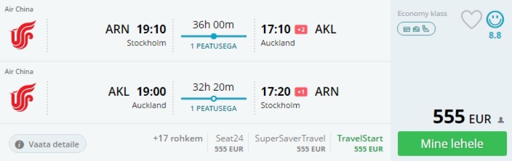 Air China pakub väga hea hinnaga lennupileteid Stockholmist Uus-Meremaale Aucklandi. Soodsad lennud on saadaval aprillis ja mais 2018. a. Minnes on pikem päevane ümberistumine Pekingis, mille jooksul jõuab Pekingit külastada. Parima hinna leiab, kui otsida väljalende Stockholmist teisipäev, neljapäev, reede ja pühapäev.
