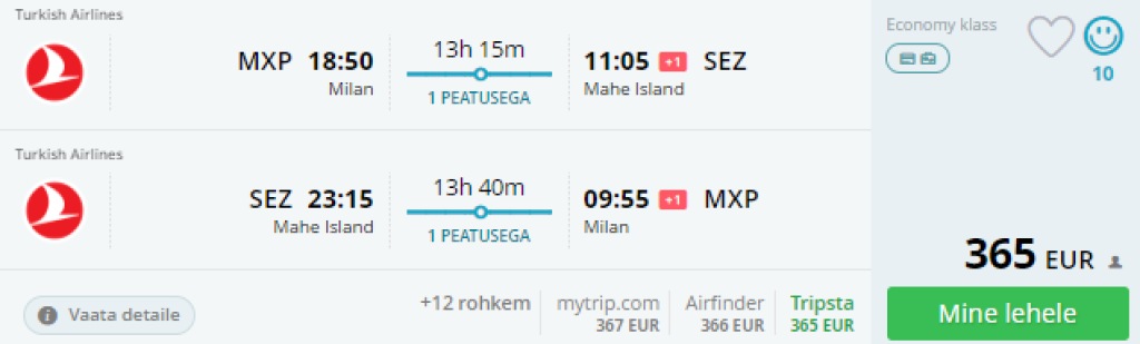Turkish Airlines pakub hetkel väga soodsa hinnaga lennuvõimalusi Seišellidele! Edasi-tagasi lennupiletid Milanost on saadaval alates 365€ eest. Valikus on ohtralt soodsaid lennukuupäevi novembrist kuni märtsini. Kõikidel väljaotsitud lennukuupäevadel eksisteerivad lennupiletid ühe mugava ümberistumisega mõlemal suunal.