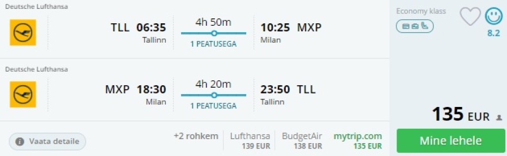 Sinna juurde võid soetada edasi-tagasi lennupiletid Lufthansaga Tallinnast Milanosse, mille hinnad algavad hetkel 135 eurost. Piletite ostmisel tasub tähelepanu pöörata, et lendude vahele jääks piisavalt aega Milanos ümber istumiseks.