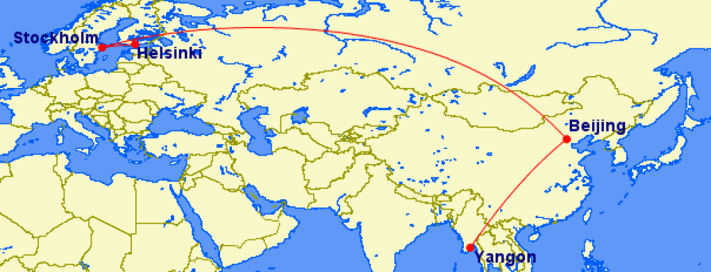 Stockholm-Yangon-Stockholm 416€Toome välja vaid ühe näidiskuupäeva. Saadavust on ka teistel kuupäevadel ning samadel kuupäevadel mis on toodud näidiskuupäevadeks lendudele algusega Helsingist. Endale sobivad lennupiletid leiad üles läbi Momondo.ee