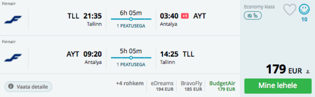 Finnair pakub hetkel väga hea hinnaga lennupileteid Tallinnast Türki, Antalyasse! Edasi-tagasi lennupiletid on saadaval vaid 179€ eest. Lennud on ühe kiire ümberistumisega Helsingis ning saadavust leidub alates aprillist kuni mai keskpaigani ning augusti lõpust kuni oktoobrini. Parima hinnaga lennupiletid leiad üles läbi Momondo.ee