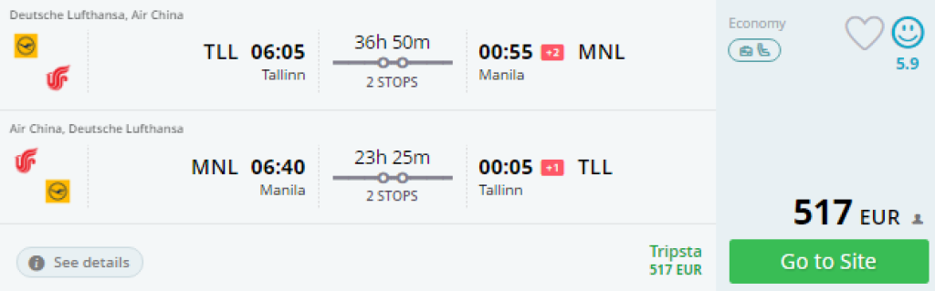 Lufthansa koostöös Air Chinaga pakub väga soodsad lennupiletid Tallinnast Filipiinidele, Manilasse hinnaga 517€. Lennud on 2 ümberistumisega Frankfurdis ja Pekingis, minnes on pikk (13h55min) vahemaanudmine Pekingis, mis annab võimaluse linnaga tutvumiseks. Soodsad lennupiletid leiad läbi momondo või kasuta otselinke allpool.