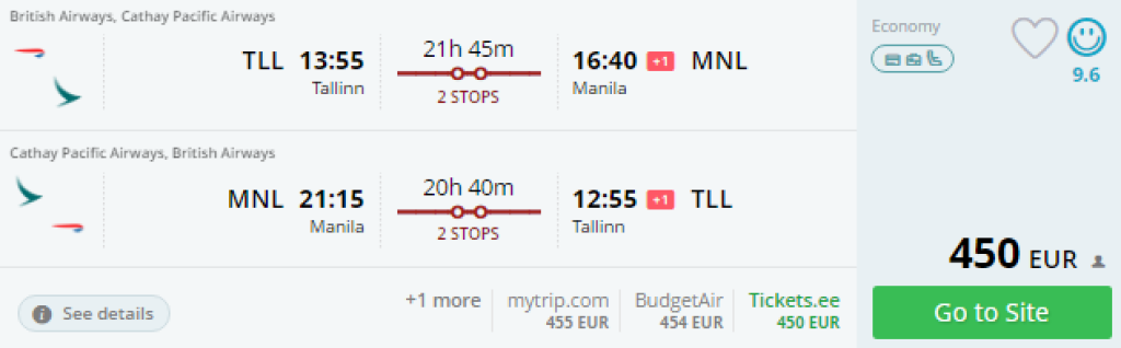 Hetkel on saadaval väga soodsaid lennupileteid Cathay Pacificuga Tallinnast või Helsingist FIlipiinidele, Manilasse hinnaga alates 359€. Mõlemal suunal kaks ümberistumist. Saadavus Helisngist on märts kuni mai ning september kuni novermber. Lennupiletid Tallinnast on saadaval ainult sügisel.Soodsad lennupiletid leiad läbi momondo või kasuta otselinke allpool.