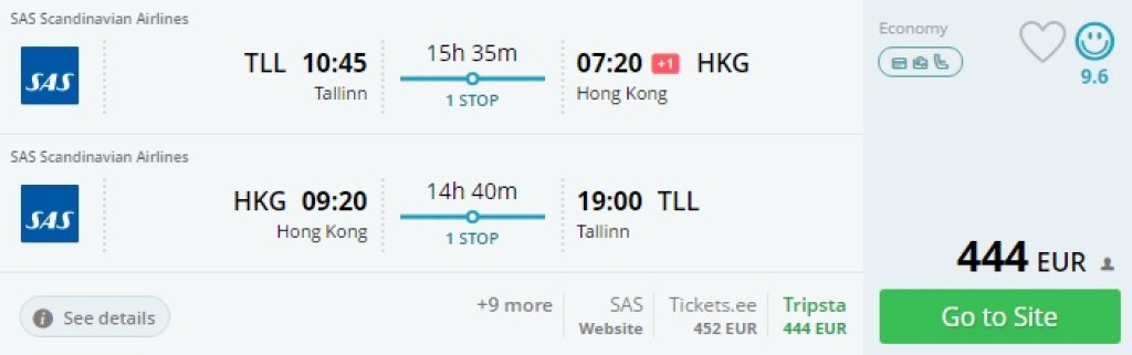 SAS pakub hetkel lennupileteid Tallinnast Hongkongi hinnaga 444€. Saadavust on alates mai lõpust juuni lõpuni ja uuesti alates oktoobri keskpaigast. Lennud on ühe ümberistumisega Stockholmis. Saadaval on ka SAS-i ja Air China lennukombinatsioon hinnaga 404€, kus tagasilend toimub üle Pekingi ja Kopenhaageni.