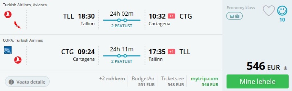 Turkish Airlines pakub lennupileteid Tallinnast Kolumbiasse Cartagenasse hinnaga alates 546€. Lennud toimuvad üle Istanbuli ja Bogota või Panama City. Mainitud linnadest lendavad Cartagenasse vastavalt Avianca ja COPA. Saadavust on alates märtsist 2018. Momondo esimeseks tulemuseks on tavaliselt veelgi soodsam lend hinnaga 543€, kuid see eeldab ligi ööpäeva Panama Citys. Alltoodud hinnad on kiirematele lendudele.