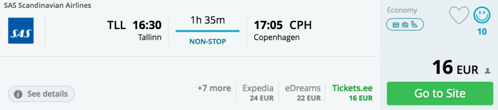 Scandinavian Airlinesi käimasoleva kampaania raames on võimalik leida ka väga hea hinnaga lennupileteid Tallinnast Kopenhaagenisse! Ühe otsa lennupiletid Kopenhaagenisse saadaval hinnaga 16€! Edasi-tagasi lennupiletite hinnad on vahemikus 55-80€ peaaegu et kõikidel kuupäevadel! Tegemist on väga hea võimalusega veeta Kopenhaagenis (pikk) nädalavahetus sest hinnad on soodsad ka lennates Tallinnast neljapäeval või reedel ning tulles tagasi pühapäeval või esmaspäeval! Soodsaid lennukuupäevi leidub novembrist kuni märtsi lõpuni. Parima hinnaga lennupiletid leiad üles otsides läbi Momondo.com