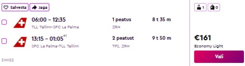 SWISS koostöös Lufthansaga pakuvad hetkel suurepärase hinnaga lennupileteid Kanaaridele. Mugavad edasi-tagasi lennupiletid Tallinnast La Palma saarele või Fuerteventurale on saadaval alates 161€ eest. Kõik väljaotsitud näidiskuupäevad on ühe mugava ümberistumisega.