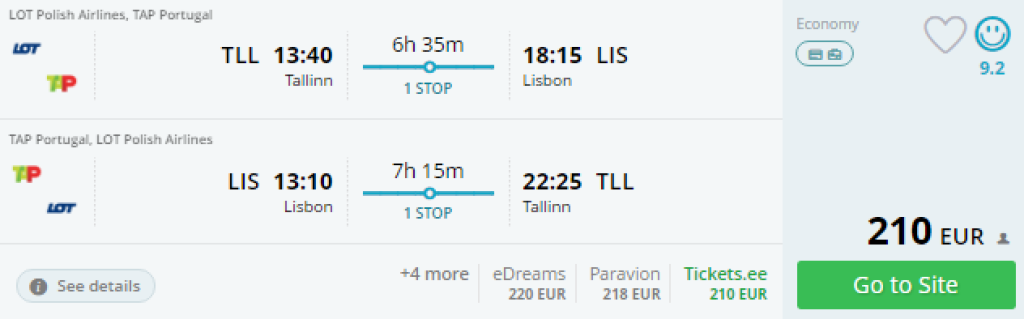 Nordica/LOT ja Portugali lennufirma TAP pakuvad soodsaid lennupileteid Tallinnast Portugali, Lissaboni hinnaga alates 210€. Saadavus on mai kuni august. Soodsad lennupiletid leiad läbi momondo või kasuta otselinke allpool.