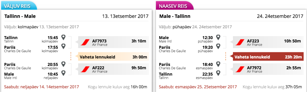 Air France alustab alates esimesest novembrist lende Pariisi ning Maldiivide pealinna Malé vahel ning pakub hetkel väga hea hinnaga lennupileteid Tallinnast Maldiividele. Kuna lend tagasi Maldiividelt Pariisi jõuab nii hilja ning lendu Tallinnasse sel päeval pole, siis tuleb tagasiteel paraku ööpäev Pariisis veeta. Iseenesest on tegemist ju hea võimalusega külastada ka Pariisi. Saadavust on novembris ning detsembris. Lennud Tallinnast toimuvad kolmapäeviti ning tagasilend Maldiivide pealinnast Malést tuleb teha kas neljapäeval või pühapäeval.