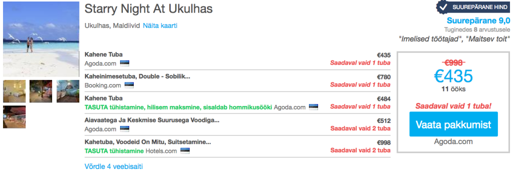 Näidispakkumine koos hotelligaVõtsime näidiskuupäevadeks 22.11-03.12 (11ööd)Lennupiletid Tallinnast Maldiividele hinnaga 448€ leiab SIITHotellisoovitusStarry Night At Ukulhas - Väga hea reitinguga (Tripadvisoris 4.5/5) tuba kahele 11-ks ööks maksab 435€.