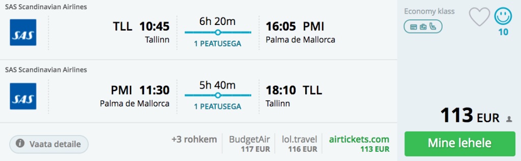 Kasuta soodsat juhust puhkamaks sügisel Mallorcal! Oktoobris on merevesi veel 20+ kraadi ning päevased temperatuurid võivad kerkida üle 25 kraadi. Kuna tegemist on juba madalhooajaga, siis leiab ka väga hea hinnaga korralikke hotelle. Edasi-tagasi lennupiletid SASiga Tallinnast Palmasse on saadaval alates 113€ eest ning lennud on ühe ümberistumisega Stockholmis. Kõik meie poolt välja otsitud näidiskuupäevad on kiirete ümberistumistega, ning ööd Stockholmis veetma ei pea.