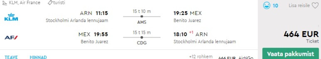 KLM ja Air France pakuvad hetkel hea hinnaga lennupileteid Stockholmist Mexico Cittsse. Edasi-tagasi lennupiletid on saadaval alates 464€ eest. Saadaval on soodsaid kuupäevi novembris ja detsembris. Sobitades sinna juurde Nordica lennupiletid Tallinnast Stockholmi (al 75€), võid lennata edasi-tagasi Tallinnast Mexico Citysse alates 539€ eest. Toome allpool välja vaid mõned näidiskuupäevad. Endale sobivad lennupiletid leiad üles otsides läbi Momondo.ee
