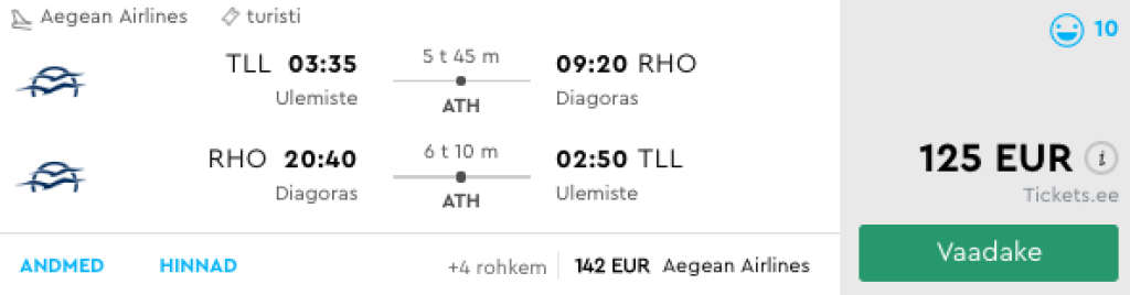 Aegean pakub hetkel väga hea hinnaga lennupileteid Tallinnast Rhodose saarele Kreekas. Edasi-tagasi lennupiletid Tallinnast Rhodosele on saadaval vaid 125€ eest. Soodsa hinnaga lennupiletid leiab üles mais-juunis. Sellise hinnaga lennupiletite saadavus on piiratud, seega soovitame huvilistel kiirustada. Tõime välja ka võimaluse veetmaks Rhodosel nädalane puhkus (6ööd).