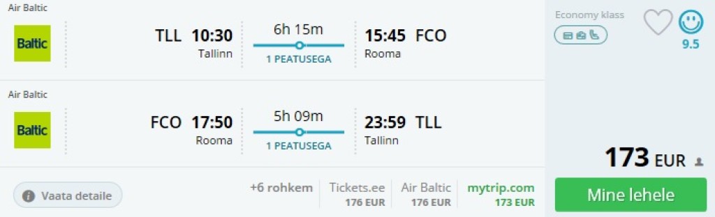 AirBaltic pakub novembris lennupileteid Tallinnast Rooma hinnaga alates 173€. Lennud on ühe vahemaandumisega Riias. Hind sisaldab käsipagasit.