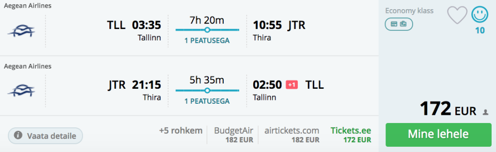 Aegean Airlines pakub jätkuvalt väga hea hinnaga lennupileteid kevadeks Tallinnast Santorini saarele. Lennud on ühe ümberistumisega Ateenas ning leiab samuti variante kus huvi korral saab päeva Ateena avastamiseks võtta. Soodsaimad lennupiletid leiad üles läbi Momondo . Otsisime välja ka soodsad hea reitinguga ning basseiniga hotellipakkumised kuueks ööks. Kombineerides lennupiletid Tallinnast ning hotelli kuueks ööks saab paketi kätte vaid 261€ eest(Reisides kahekesti). Pakkumise soetamiseks tuleb eraldi broneerida nii lennupiletid kui hotell.