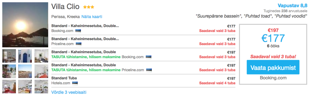 Otsisime välja võimalused veeta soodsalt nädalane puhkus Santorini saarel. Lennupiletid Tallinnast Santorinile on saadaval vaid 172€ eest ning soodsaima basseiniga hotelli kahele leiab 177€ eest. Hetkel varakult ette broneerides leiab väga hea hinnaga öömaja läbi hotellide hinnavõrdlusportaali HotelsCombined.ee