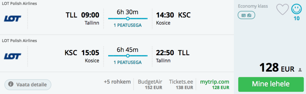 LOT pakub hetkel väga hea hinnaga lennupileteid suve lõpuks ning sügiseks Tallinnast Slovakkia suuruselt teise linna Košicesse. Edasi-tagasi lennupiletite hinnad on alates 128€. Meie poolt välja otsitud lennupiletid on mõlemal suunal ühe kiire ümberistumisega Varssavi lennujaamas. Parima hinnaga lennupiletid leiab üles otsides läbi MomondoKui soovid külastada Slovakkiat koolivaheajal, siis lennupiletite hinnad on kuskil 160€.****ReisikindlustusReisikindlustusega oled reisiüllatusteks alati valmis. Sõlmi leping PZU e-poes ja saad kuni 15% soodustust!