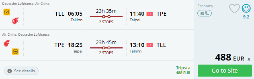 Lufthansa ja Air China pakuvad väga soodsaid lennupileteid Tallinnast Taivani, Taipeisse hinnaga 488€. Lennud on kahe ümberistumisega Frankfurdis ja Pekingis ning saadavus on veebruar kuni aprill. Soodsad lennupiletid leiad läbi momondo või kasuta otselinke allpool.