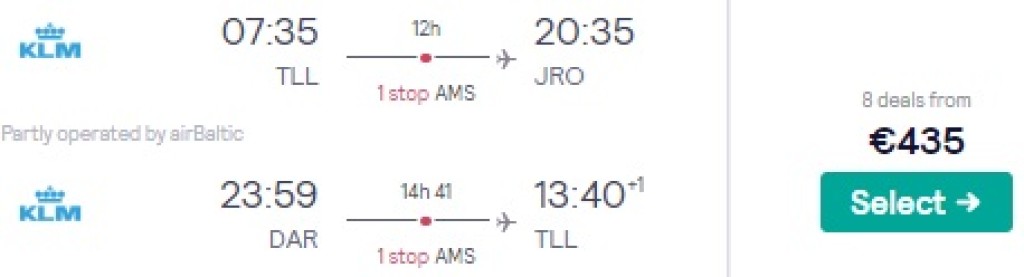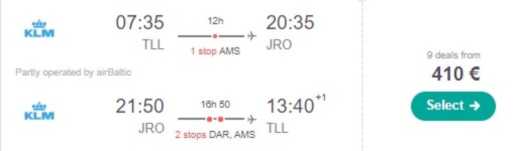 Hetkel leiad väga hea hinnaga lennupileteid Tallinnast Tansaaniasse (Kilimanjaro, Dar Es Salaam, Sansibar). Soodsa hinnaga lennupileteid pakub KLM. Hea hinnaga lennupileteid leiab veebruarist kuni maini. Piletiteni jõudmiseks kasuta allpool olevaid otselinke või otsi endale huvipakkuvad lennupiletid üles läbi Skyscanneri.