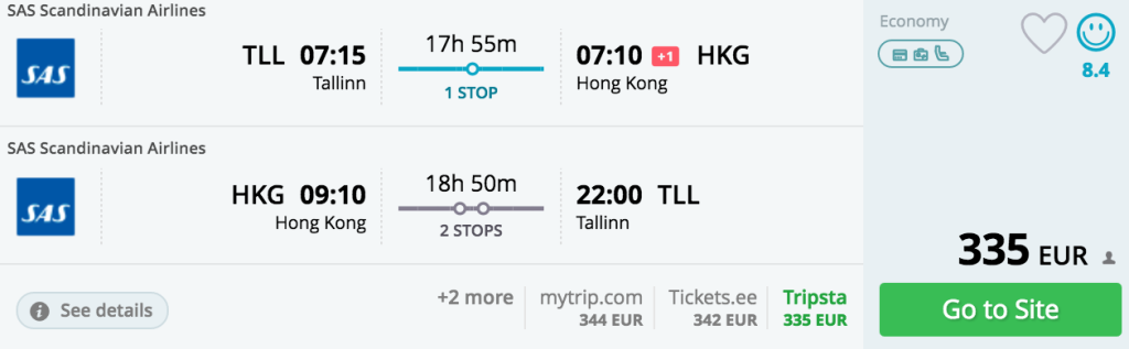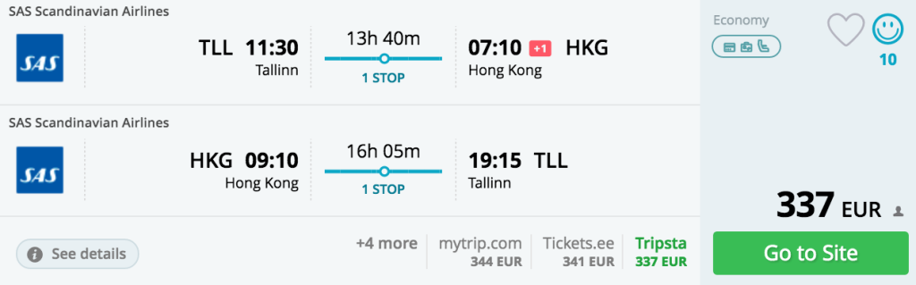 Tänasest alanud SASi kampaania raames on võimalik leida ka vägagi hea hinnaga lennupileteid Tallinnast Hong Kongi. Edasi-tagasi lennupiletite hinnad saadaval hinnaga al. 335€. Lennud on ümberistumis(t)ega kas Stockholmis või Kopenhaagenis. Soodsad lennupiletid on saadaval lendamiseks vahemikus november-märts! Kampaania kestab kuni 18.09 ning soodsate piletite arv on piiratud seega soovitame huvi korral kiirustada.