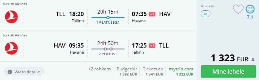 Mitmeid aastaid järjest Euroopa parimaks lennufirmaks valitud Turkish Airlines pakub hetkel väga hea hinnaga äriklassi lennupileteid Tallinnast Kuuba pealinna Havannasse. Äriklassi hinnad ~1300€ on võrreldavad näiteks Air France’i premium economy hindadega ja orienteeruvalt 2x odavam teiste lennufirmade äriklassi hindadest. Turkish Airlines lendab Havannasse marsruudil Istanbul – Havanna – Caracas – Istanbul, seega on tagasiteel kiire peatus ka Caracases.