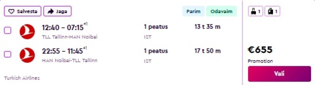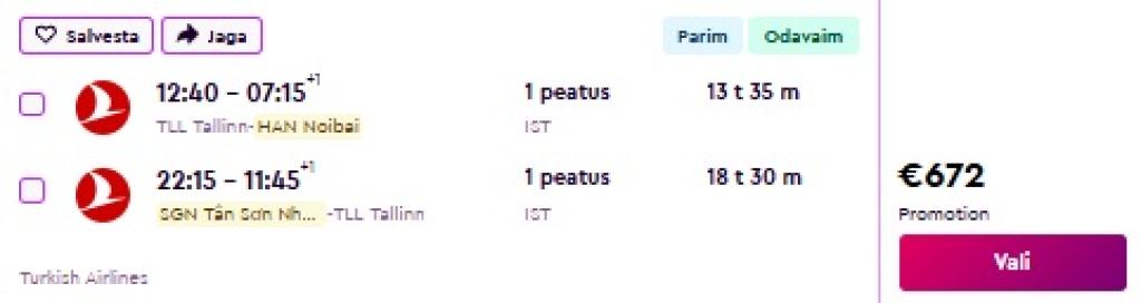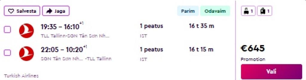 Turkish Airlines pakub hetkel väga hea hinnaga lennupileteid Vietnamisse. Edasi-tagasi lennupiletid Tallinnast Ho Chi Minh Citysse ja/või Hanoisse on saadaval alates 645€ eest. Lendudel on mõlemal suunal kiire ümberistumine Istanbulis. Soodsad piletid on leitavad ka jõuludeks ja aastavahetuseks!