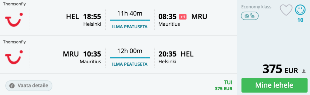 Soome reisikorraldaja TUI pakub hetkel väga hea hinnaga lennupileteid otselendudele Helsingist Mauritiusele. Lennupiletid on saadaval perioodiks 07.02-22.02 ning hinnaga vaid 375€. Soodsate lennupiletite ülesleidmiseks kasuta otselinki allpool või sisesta lennukuupäevad momondosse.