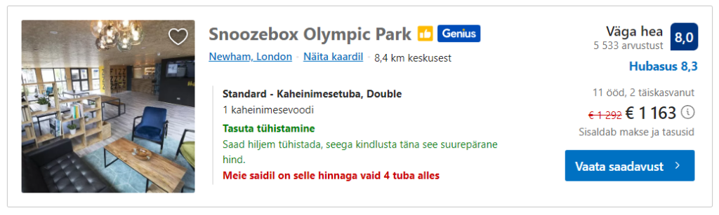 Kui otsid soodsa hinnaga majutust Londonis, siis soovitame parima ülevaate ja hinna saamiseks kasutada hotellihindade võrdlusportaali Booking.com