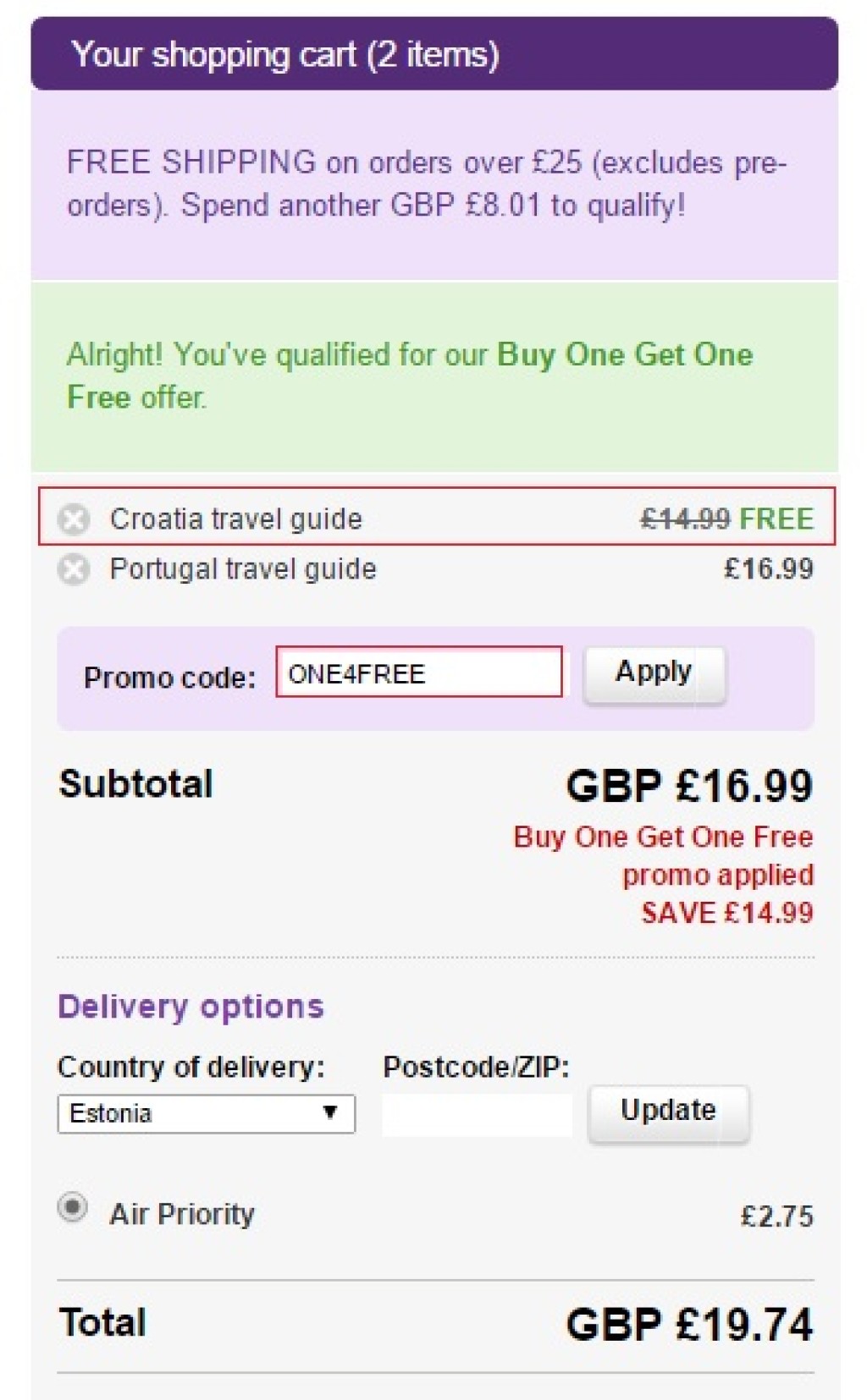 Maailma tuntuimal reisijuhtide kirjastusel Lonely Planet on käimas kampaaniapakkumine, kus iga ostetud reisijuhiga saab ühe reisijuhi kaasa tasuta. Selleks tuleb Lonely Planeti kodulehel reisijuhid ostukorvi lisada ja enne maksmist lisada sooduskood (väli Promo code:) ONE4FREE. Peale koodi lisamist (Apply) saab kahest reisijuhist madalama hinnaga raamatu tasuta. Tellida võib ka rohkem, kui 2 raamatut - endiselt on iga teine raamat tasuta. Pakkumine kehtib nii paber- kui e-raamatutele. Valides sihtriigiks Eesti, kuvatakse hinnad millegipärast naeltes, hinda eurodes näeb, kui korraks panna sihtriigiks Soome. Pakkumine 1+1 kestab kuni 22. maini 2017.a. Telli reisijuhid Lonely Planeti kodulehel.