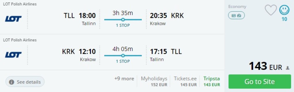 LOT pakub kevadel ja suvi läbi lennupileteid Tallinast Poola lõunaosas asuvasse Krakowisse hinnaga 143€. Kuupäevavalik on tõesti lai, lihtsalt katseta ja leiad. Boonuseks see, et paljudel kuupäevadel on ümberistumised Varssavis väga kiired.