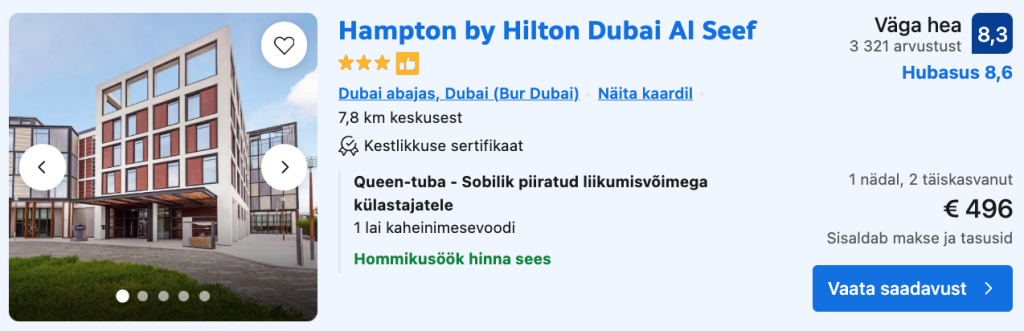 Toome allpool välja lennud + hotell näite, kuidas ise broneerides saab nädalase puhkuse (7 ööd) Dubais kätte vaid 586€/in. Hinnas nii LOTi lennupiletid Tallinnast kui tuba kahele koos hommikusöökidega Hiltoni hotelliketti kuuluvas hotellis.
