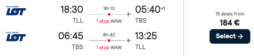 LOT pakub hetkel suurepärase hinnaga lennupileteid Gruusiasse. Edasi-tagasi lennupiletid Tallinnast Tbilisisse on saadaval alates 184€ eest.