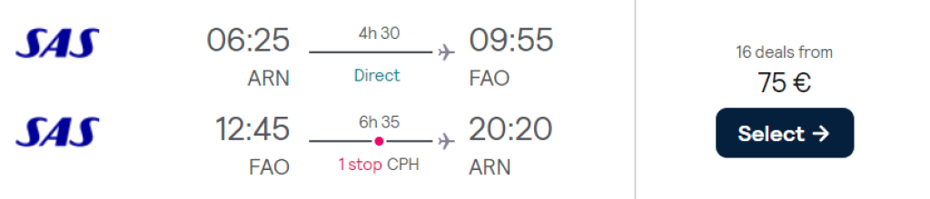 SAS pakub hetkel suurepärase kampaaniahinnaga lennupileteid Lõuna-Portugali, Algarve piirkonda. Edasi-tagasi lennupiletid Stockholmist Farosse on saadaval alates 54€ eest. Tegemist on nii otselendude kui ka ühe kiire ümberistumisega lennupiletitega. Soodsa hinnaga lennupileteid leidub detsembrist veebruarini ning mais-juunis 2024, lennupiletite hulgas on ka jõuluperiood. Parima hinnaga lennupiletid leiab läbi Skyscanneri.