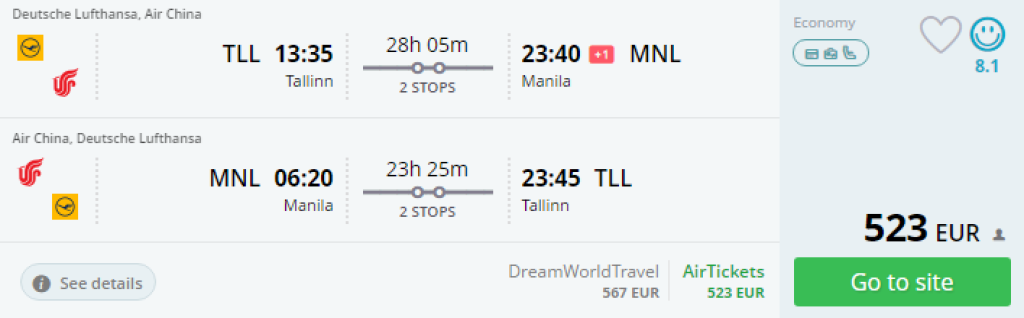 Hetkel on saadaval soodsad lennupiletid Tallinnast Filipiinidele! Edasi- tagasi lennupiletite hinnad algavad 523 eurost. Saadaval on lennukuupäevi märtsikuusse. Piletiteni jõudmiseks leidmiseks kasuta otselinke allpool või otsi lennupiletid üles momondo.co.uk abil.