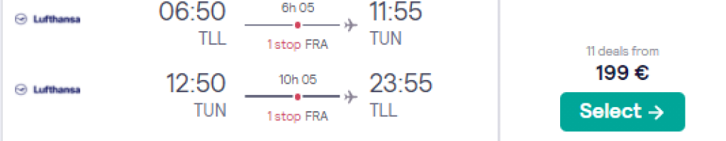 Lufthansa pakub hetkel väga soodsa hinnaga lennupileteid Tuneesiasse. Edasi-tagasi lennupiletid Tallinnast Tunisesse on saadaval alates 199€ eest ning ohtralt soodsa hinnaga lennupileteid leiab oktoobri lõpust kuni juunini 2022. Lennud on mõlemal suunal ühe ümberistumisega Frankfurdis. Parima hinnaga lennupiletid leiad üles läbi Skyscanneri, kui aga soovid osta piletid otse lennufirma käst, siis mine Lufthansa.com ja sisesta lennukuupäevad otsingusse.