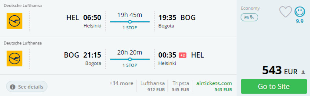Lufthansa pakub hetkel väga soodsaid edasi-tagasi lennupileteid Helsingist Kolumbia pealinna Bogotasse hinnaga alates 543€. Saadavus septembrist märtsini. Lennud ühe kiire ümberistumisega Frankfurdis mõlemal suunal. Soodsaid lennukuupäevi kontrolli momondos või kasuta otselinke allpool.