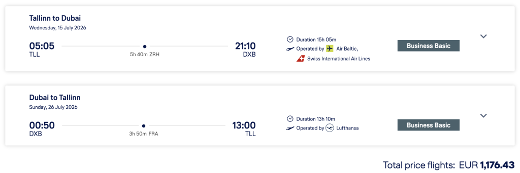 Lufthansa Grupi lennufirmad pakuvad hetkel väga hea hinnaga lennupileteid äriklassis Tallinnast Araabia Ühendemiraatidesse. Saadavust leiab enamjaolt suveks aga mõnevõrra kallima hinnaga lennupileteid leiab ka kevadel ja sügisel.