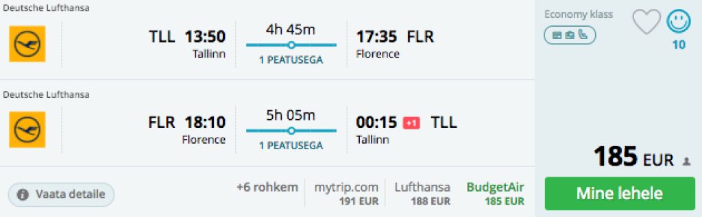 Lufthansa pakub hetkel väga hea hinnaga lennupileteid Tallinnast Toskaanasse. Edasi-tagasi lennupiletid Tallinnast Firenzesse on saadaval vaid 185€ eest ning saadavust jagub kevadest kuni augusti lõpuni välja. Lennud on ühe ümberistumisega Frankfurdis. Enamus juhtudel on ümberistumsied kiired. Tõime välja näidiskuupäevad kevadeks. Soodsaimad lennupiletid leiad üles läbi Momondo