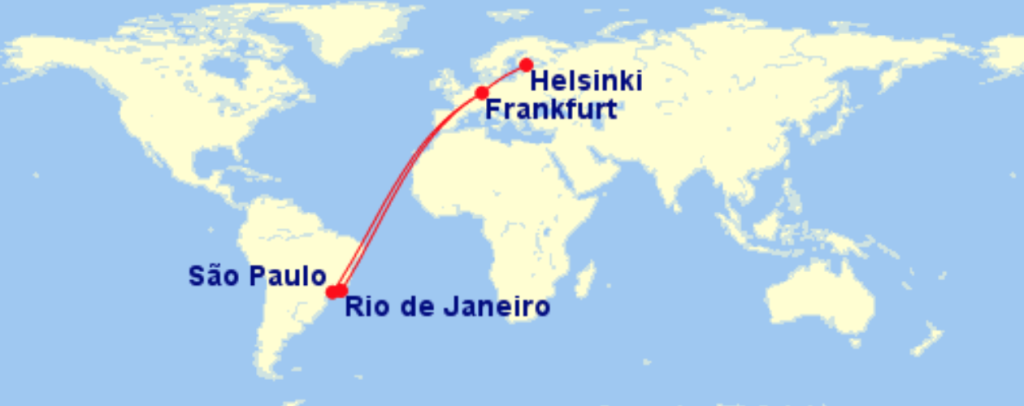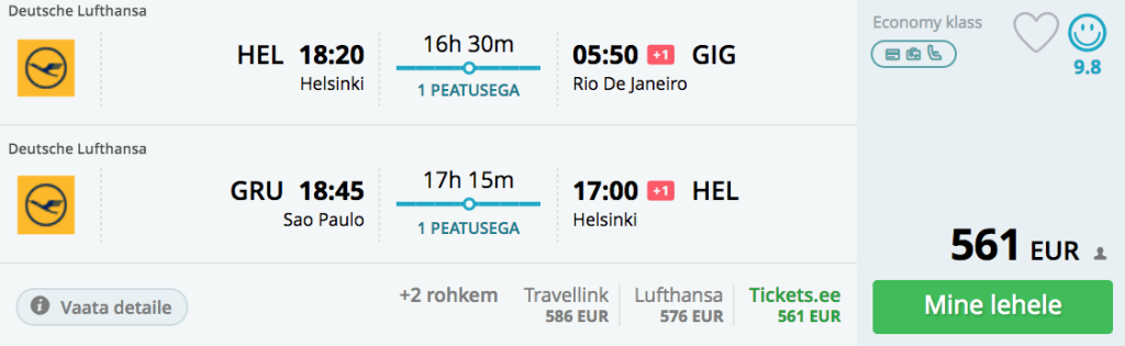 5 tärni lennufirma Lufthansa pakub hetkel väga hea hinnaga lennupileteid Helsingist Brasiiliasse. Valikus on nii Sao Paolo kui Rio de Janeiro. Soodsa hinnaga pileteid leiab alates oktoobrist kuni aprillini välja. Lennud Helsingist väljuvad üldjuhul õhtul ning saabuvad samuti õhtul 5 paiku, mis tähendab et saab ilusti Helsingi lennujaama kohale minna ning tagasi Tallinna mõnda laevaoperaatorit kasutades.