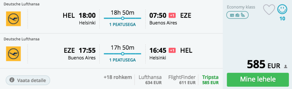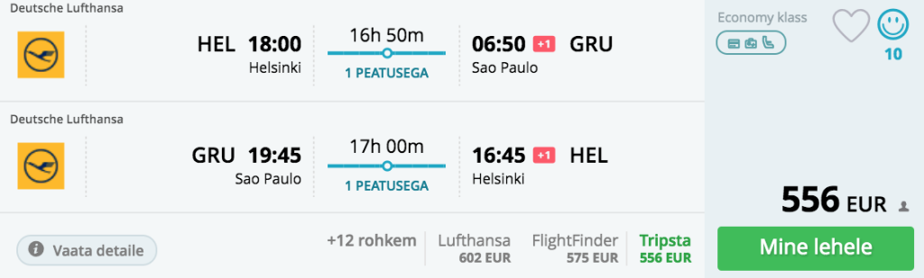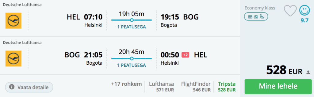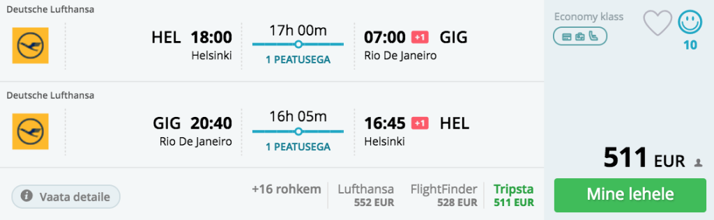 5 tärni lennufirma Lufthansa pakub hetkel väga hea hinnaga lennupileteid Helsingist Lõuna-Ameerikasse. Valikus on nii Brasiilia, Kolumbia kui Argentiina. Soodsa hinnaga pileteid leiab alates oktoobrist kuni aprillini välja.