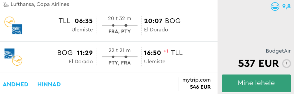 Tallinn-Bogota-Tallinn alates 537€Tihtipeale on kiirete ümberistumistega lennud vaid mõne euro võrra kallimad.