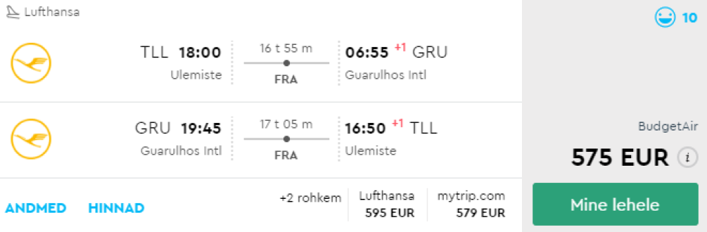 Kahel järjestikusel aastal Euroopa parimaks lennufirmaks tunnistatud Lufthansa pakub hetkel väga hea hinnaga lennupileteid Tallinnas Lõuna-Ameerikasse. Lennud on valdavalt ühe kiire ümberistumisega Frankfurdis. Saadavus varieerub sihtkohati ning jõuludeks ja aastavahetuseks sellise hinnaga lennupileteid ei ole. Samas on Lõuna-Ameerikas Euroopa talve ajal suvi ning ka märtsis võivad näiteks päevased temperatuurid Buenos Aireses üle 25 kraadi tõusta. Valikus on nii Brasiilia (Sao Paolo, Rio de Janeiro), Kolumbia (Bogota) kui Argentiina (Buenos Aires). Soodsa hinnaga pileteid leiab alates novembrist kuni aprillini välja.Piletiteni jõudmiseks kasuta otselinke allpool või otsi lennupiletid üles läbi Momondo.eeHinna sees on nii äraantav pagas kui toitlustamine pardal.
