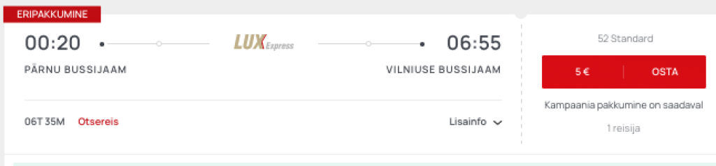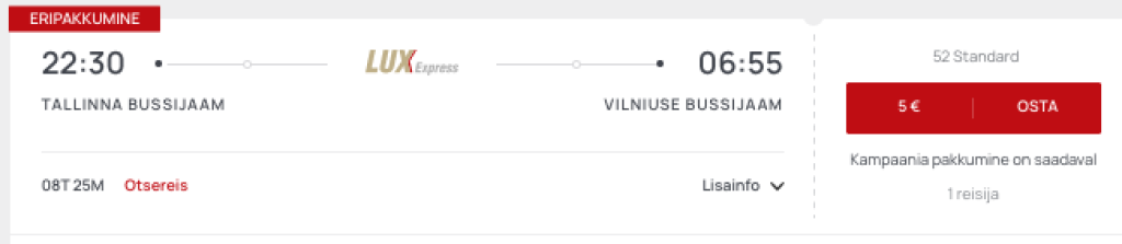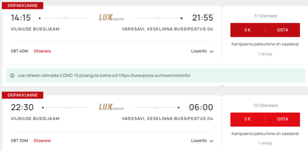 Lux Express pakub hetkel väga hea hinnaga bussipileteid Tallinnast Vilniusesse ja Vilniusest edasi ka Varssavisse. Bussipiletid Tallinnast ja Pärnust Leedu pealinna Vilniusesse ja ka Vilniusest Poola pealinna Varssavisse on saadaval vaid 5€ eest. Seega on võimalik saada edasi-tagasi bussipiletid Tallinnast Vilniusesse 10€ ning Varssavisse 20€ eest. Bussisõit Tallinnast Vilniusesse kestab veidi üle 8h.